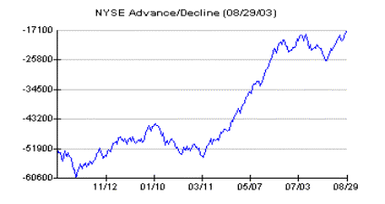 The NYSE Advance/Decline (A/D) Line is a daily running total of the number of NYSE stocks that advances minus those that decline. It is a good measurement of the markets breadth or strength and is an invaluable indicator when attempting to forecast the markets direction. Often, as the end of a bull phase nears, the A/D Line begins to roll over while the DJIA continues to make new highs. Conversely, at major bottoms, the A/D Line will bottom and begin to move up several months before the DJIA puts in its final bottom. Market technicians refer to this phenomenon as bearish divergence at market tops and bullish divergence at bottoms.