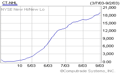 The daily and weekly number of new 52-week highs and lows is also a good indication of the markets strength. It isn't necessarily the number that is important, but whether the numbers are expanding or contracting. When the market is in a long-term down trend, the number of new highs will be diminishing while the new lows will expand. As the market tries to find a bottom, a shift will begin to occur as the number of new lows begins to contract. Conversely, at significant tops the number of new highs will begin to contract. If the DJIA makes a new high or new low and the move is not confirmed by an expansion of the number of highs at market tops or lows at a bottom, a trend reversal is usually at hand.