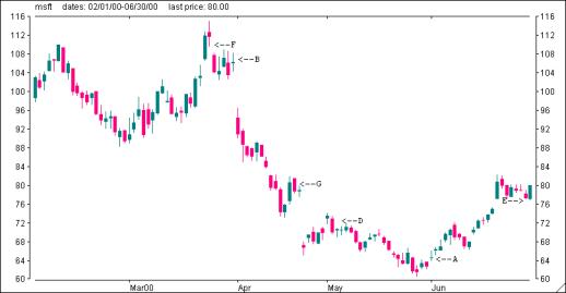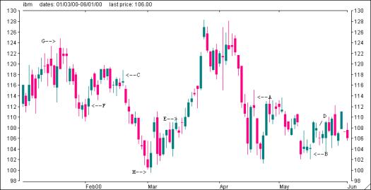 Candlestick Charts ![]() Minor Chart Formations: A) Star: Stars indicate reversals. A star is a small body candlestick that occurs after a candlestick with a large body and the bodies don't overlap. B) Hammer: A small body and a long lower shadow. The body can either be red or green. This is a bullish candle if followed by a significant up-trend. C) Hanging Man: The opposite of a hammer, small body and a long upper shadow. This is a bearish candle if followed by a significant down-trend. D) Harami: A formation which denotes a decrease in momentum. It occurs when a candle with a small body follows a candle with a large body. A red candle followed by a green candle would suggest a decrease in downward momentum. The opposite scenario, a green candle followed by a red one, would indicate a decrease in upward momentum. E) Doji: Open and close are the same price. Dojis reflect indecision. F) Piercing Line: A two-candle formation when the first candle is a long red line followed by a long green line candle. The second candle opens lower than the first candles close and closes above the first candles mid-point. This is a bullish pattern. G) Shooting Star: A two-candle configuration that signals a minor bearish reversal if it occurs after a rally. The first candle is a long green line followed by a star candle with a long upper shadow. H) Morning Star: A bullish configuration consisting of three candles. The first candle is a long red line followed by a red or green star. The third candle is a long green line. ![]() Major Chart Formations: The following are the most significant major bullish/bearish chart formations. An example of each is located on the above chart of MSFT with the exception of C (Abandoned Baby Doji). A) Gravestone Doji: A doji (open and close are the same) and the high is significantly higher than the open, high and closing prices. This formation typically occurs at the bottom of a trend and signals a bullish reversal. B) Dragonfly Doji: A doji (open and close are the same) and the low is significantly lower than the open, high and closing prices. This formation typically occurs at the top of a trend and signals a bearish reversal. C) Abandoned Baby Doji: A doji, which occurs at the bottom of a chart formation with gaps on both sides of the doji. D) Harami Cross: This formation signals a market top. It consists of a harami, which is a long black line candlestick which precedes and engulfs a doji with no body. E) Engulfing Pattern: A two-candle bullish formation consisting of a small long red line engulfed by the second candle, a long green line. F) Evening Star: A bearish pattern usually occurring at a top. The formation consists of three candles. The first is a long green line followed by a star and then a long red line. The star can be either red or green. G) Dark Cloud Cover: A two candle formation whereby the first candle is a long green line and the second candle is a long red line whose body is below the center of the first candle. This is a bearish formation. The Market Edge 'Smart Chart ' component provides candlestick charting along with bar, line and Point & Figure charting capabilities. To activate Smart Chart, click on 'Launch Smart Chart' located in the upper right hand corner of any page. Click on 'Chart Type' and then on 'Candle". |