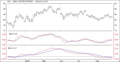 Below is a six month chart of IBM from 3/1/03 - 9/1/03. The first graph under the chart is MACD-ST. The second graph is the MACD-LT. Notice the frequent number of crosses generated by MACD-ST versus those from the MACD-LT indicator.