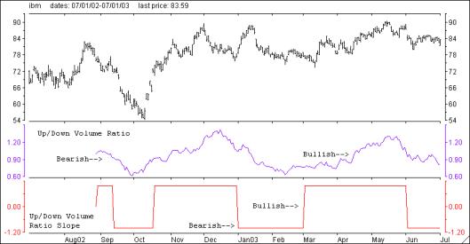 Although the U/D Ratio is a powerful indicator, testing has concluded that it is the trend or slope of this ratio that signals a change in the trend of a stock's price not the raw value. The reason is simple. A ratio that is increasing from 1.2 to 2.5 indicates that there is a growing amount of buying induced volume, a bullish condition. However, if the ratio is declining from 2.5 to 1.2 there is an increase in selling induced volume, which is a bearish situation. In either case the U/D ratio is regarded as bullish since it is above 1.0.